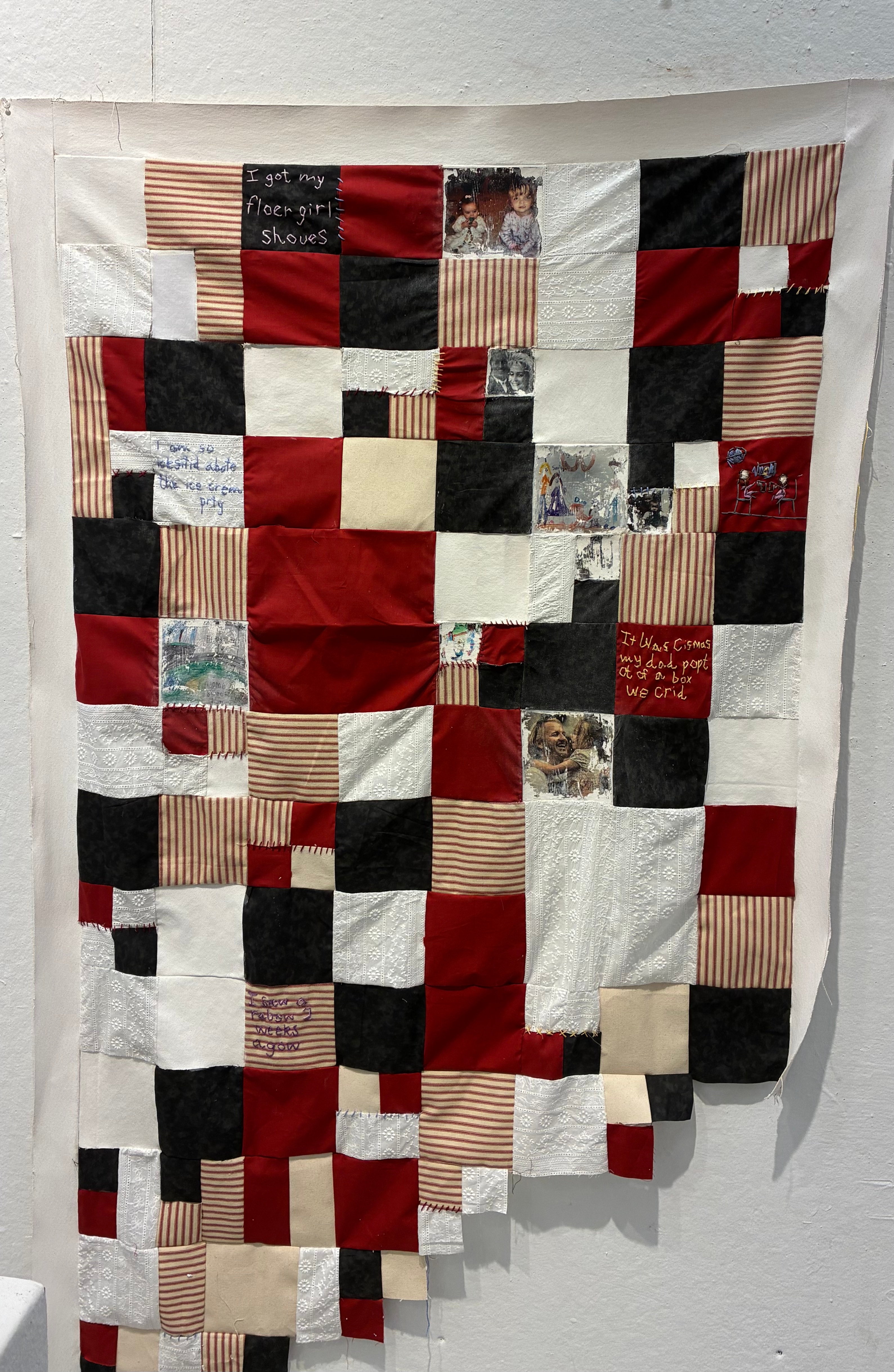 The current piece I am working on is something of a physical piecing-together of my early childhood. Quilting, an art taught to me by my grandmother, carries universal connotations of domesticity, tradition, handmade, handworn, and deeply emotional ties. The content displayed and embroidered into the surface of this blanket is all derived from my past as well as the past of my immediate family members: primary school journal entries, childhood drawings, and photos from my Mom’s shiny red Nikon. The work is intended to be an investigation into childhood naïveté, familial roots, the immense magnitude of the self, and memory as a faculty of the soul; a dive into the question of how to reconcile this past version of yourself that you cannot recall, one who made memories that you cannot recall, into who you are today. I also seek to explore of the duality of familial relationships, childhood, and the premature loss of innocence and withering away of wonder that occurs along this path.